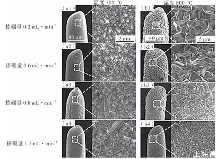 圖2為不同沉積參數下BDD微電極表面形貌SEM圖。從圖2可見:當沉積溫度為700℃時,摻硼濃度的變化對薄膜的形貌影響不大,薄膜致密連續,大量的晶粒呈現葉層狀結構,晶粒大小約為1μm;當沉積溫度為800℃時,摻硼量為0.2和0.4 mL·min-1時,隨著沉積溫度的升高晶粒變得粗大約為5μm;當摻硼濃度增大到0.8和1.2 mL·min-1時,金剛石晶粒尺寸反而變小,晶面和晶界變得很模糊,出現蝴蝶狀的晶粒形狀。值得注意的是,當沉積溫度為800℃時,摻硼量為0.2和0.4 mL·min-1的電極尺寸大于摻雜量為0.8和1.2 mL·min-1的,這說明沉積氣氛中硼含量過高不僅會降低薄膜質量,還會降低薄膜的生長速率,這種抑制作用在較高溫度下更加明顯。究其原因是因為在較高溫度下能形成更多激活態的硼原子,其替換碳原子進入金剛石晶格中,過量的硼會誘發更多的結構缺陷,這些缺陷成為新的形核點,有利于提高金剛石的形核率,同時阻礙晶粒的長大,使得晶粒得到細化,同時也在一定程度上破壞了晶粒的完整性,從而使晶形變差,導致薄膜質量下降及生長速率降低。