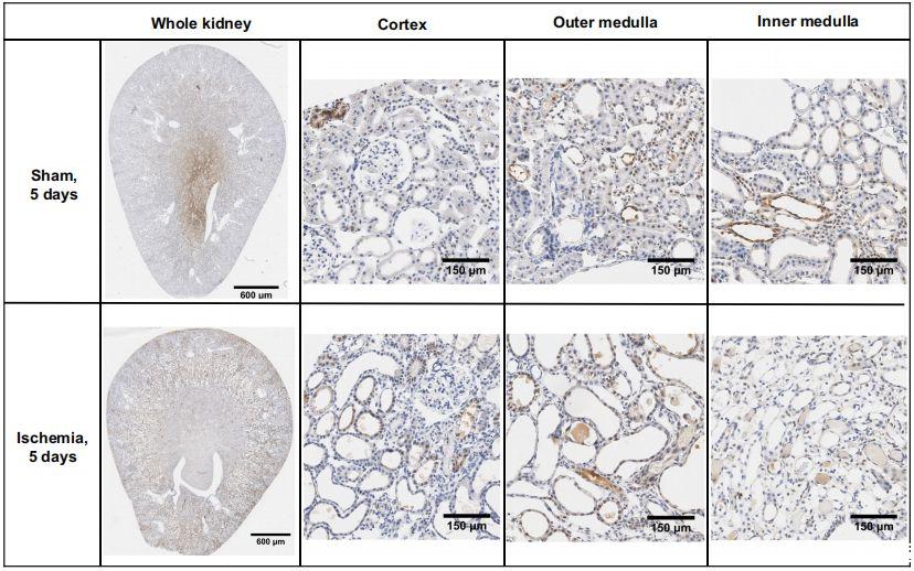 圖4、雙側腎缺血或假手術恢復5天后腎臟切片的咪唑加合物免疫組化圖。圖片為每組六個腎臟皮質、外髓質和內髓質區域的典型圖像。