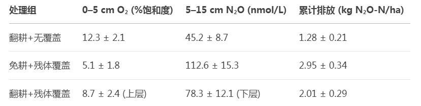 免耕+覆蓋組合O?最低,N?O排放最高(反硝化主導(dǎo))。