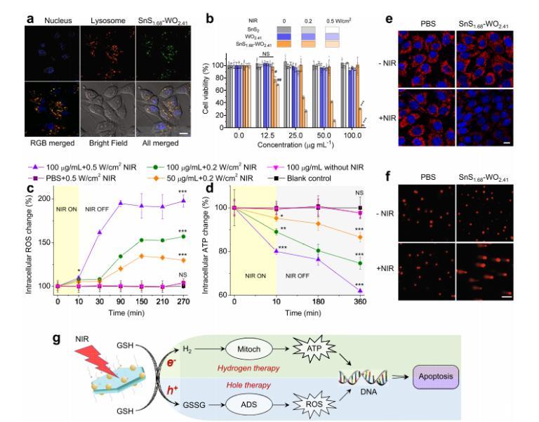圖4、SnS1.68–WO2.41納米催化劑的空穴/氫氣聯合治療表現與機制。(a)SnS?.??–WO?.??納米催化劑在細胞內培養4小時后的攝取行為;(b)在有/無NIR照射(808 nm,0.2或0.5 W/cm2,10分鐘)的條件下,SnS?.??–WO?.??納米催化劑對4T1細胞的細胞毒性(n=5個生物學獨立樣本);(c)在有/無NIR照射條件下,SnS?.??–WO?.??處理的4T1細胞內ATP水平的監測(n=6個生物學獨立樣本);(d)ROS水平的監測(n=6個生物學獨立樣本);(e)SnS?.??–WO?.??+NIR處理對線粒體的影響(實驗獨立重復三次,結果相似);(f)SnS?.??–WO?.??+NIR處理對4T1細胞DNA的影響;(g)基于SnS?.??–WO?.??納米催化劑的空穴/氫氣聯合治療的機制示意圖。