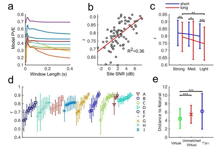 圖5.(a)將比較限制在每個刺激脈沖后的可變長度時間窗口時的模型準確性。每條曲線代表一只動物。PVE:解釋方差百分比。(b)控制再現準確性與自然觸摸LFP反應信噪比(SNR)的函數關系。每個點代表一個觸摸部位。(c)控制再現準確性與觸摸參數的函數關系(:p<0.05,:p<0.01,:p<0.001,Bonferroni校正。誤差條:±1標準差。N=73個觸摸部位,所有動物)。(d)所有動物中所有觸摸部位的控制再現準確性。(e)自然觸摸反應與虛擬觸摸(N=438)、不匹配虛擬觸摸(N=438)和基于速率的刺激(N=162)反應之間的馬氏距離。顯著性和變異性表示方式與(c)相同。
