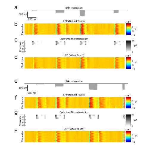 圖3.(a)由觸覺器位置隨時間變化測量的皮膚壓痕(負值表示向皮膚方向)。曲線陰影部分表示觸覺器與皮膚接觸的時間段。(b)自然觸摸期間32個電極通道的多通道S1局部場電位(LFP)。通道按該觸摸部位的整體反應幅度排序。(c)通過八個通道施加的優化微刺激。陰影表示電流幅度,通道按該觸摸部位的整體使用情況排序。(d)優化微刺激(“虛擬觸摸”)期間的S1局部場電位。(e)–(h)不同數據集的類似圖。