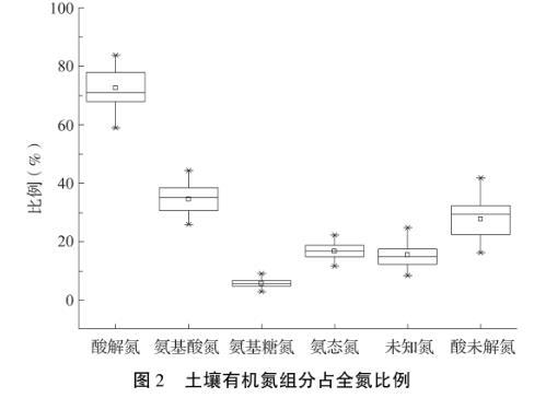 表2顯示,酸解氮中,各土樣均以氨基酸氮含量最高,以氨基糖氮含量最少,氨態氮和未知氮含量介于其間;計算得知試驗土壤間各酸解有機氮組分含量變異系數達34.3%~41.2%,具有中等變異性。不同酸解有機氮組分占全氮含量比例的差異亦較大,氨基酸氮、氨基糖氮、氨態氮和未知氮占全氮的比例分別為25.6%~43.1%、2.6%~9.0%、11.9%~22.3%和8.0%~25.3%(圖2)。