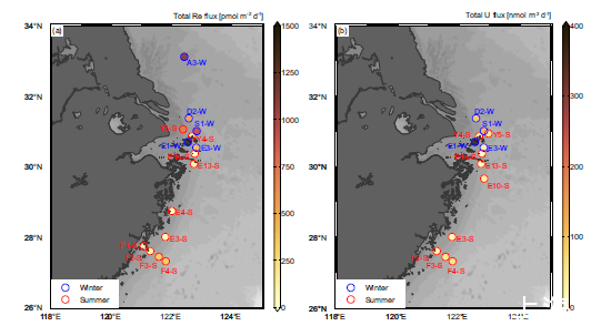 圖2、東海沉積物中Re和U的還原去除通量的空間變化。a,b分別為Re和U的通量。冬季和夏季調(diào)查站點分別用藍色和紅色圓圈標記。