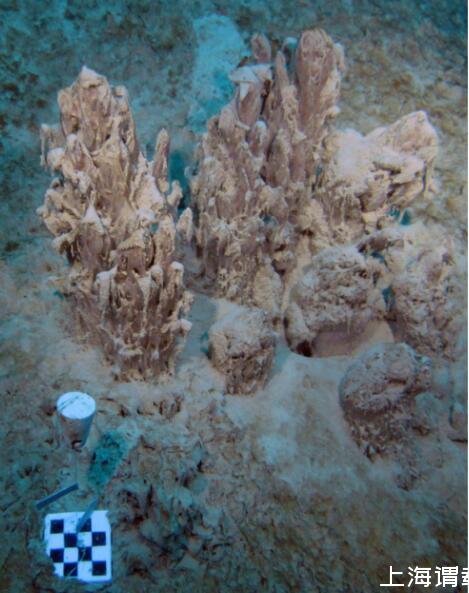 圖2、喬伊斯湖23米深處分支柱狀疊層石簇。浮標上的方格為1平方厘米。