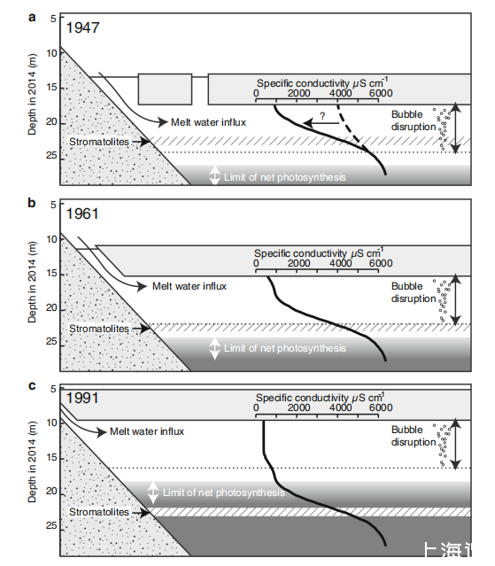 圖5、基于1947年和1961年航拍照片及1991年湖水位測量結果的疊層石生長環境解釋。所有面板的導電率剖面來自2014年,假設深層鹽水混合產生觀測到的密度躍層(a),隨后水位上升導致淡水層加厚(b)。低水位時氣泡脫落可促使疊層石開始生長(a)。1961年水位上升降低了氣泡生長及脫落,密度分層導致環境水體隔離(b)。1991年疊層石位于光照不足以維持凈光合作用生長的深度(c)。