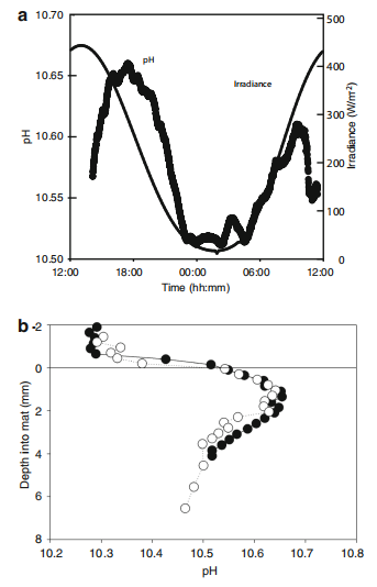 應用Unisense Field DataLogger Mini系統,配備p50 pH微電極。pH微電極被用于測量喬伊斯湖底棲微生物墊中的pH剖面。潛水員在12米深處部署了微型操控器,使用pH微電極對微生物墊進行剖面測量。潛水員使用微型操控器以每0.5毫米的增量將電極從水體垂直推進至微生物墊中。電極記錄微生物墊中pH隨深度的變化。在2014年11月23–24日的一個晝夜周期中,pH在擴散邊界層的一個點位上被連續測量。測試數據發現在12米深處的底棲微生物墊中,pH剖面在空間上存在顯著變化。接近正午時,底棲PAR為7.1μmol photons m?2s?1,水柱中環境pH為10.3。在藻墊與水體界面處pH升至10.5,在藻墊下0.5至2毫米處pH超過10.6,到藻墊下5毫米處,pH降至10.5以下。通過對測試數據分析發現,pH的變化與光照強度的變化密切相關。在光照強度較高的時段,pH值顯著升高,這表明微生物墊中的光合作用在這些時段更為活躍,吸收了更多的碳酸氫根(HCO??),導致pH升高。在陰影遮蔽時,pH值降低,證實了光合作用對pH變化的直接影響。