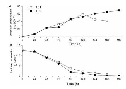 圖3、在不同的培養前準備和接種(T01和T02)實驗中,(A)洛伐他汀和(B)乳糖濃度的時間變化。