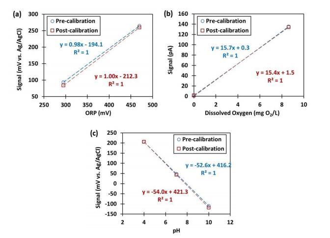 圖S3.乳液樣品剖面測量前后(a)ORP、(b)DO和(c)pH微電極的校準曲線。