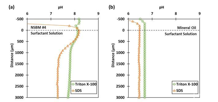 圖4(a)NSBM#4與表面活性劑樣品(100 ppm Triton X-100 vs SDS)及(b)礦物油與表面活性劑樣品的空間pH變化。0μm代表油水界面。表面活性劑溶液使用純DI水制備。