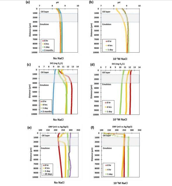圖5陰離子表面活性劑(SDS)和鹽度對水包油乳液(1%NSBM#4+SDS)中空間與時間維度pH、DO及ORP變化的影響。(a)無NaCl的pH剖面,(b)含0.1 M NaCl的pH剖面,(c)無NaCl的DO剖面,(d)含0.1 M NaCl的DO剖面,(e)無NaCl的ORP剖面,(f)含0.1 M NaCl的ORP剖面。0μm表示傳感器接觸油相時的信號點。油與乳液界面在剖面的灰色區域內隨時間變化。