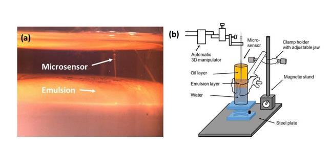 對于微剖面測量,將乳液樣品置于微剖面室(50 mL自立式管,EW-06344-25,Cole Parmer)中,使用夾具固定(圖S4)。使用三維(3D)微操縱器(UNISENSE A/S,Denmark)實現微電極尖端在樣品中的定位和移動,并使用帶有CCD相機(World Precision Instruments,Sarasota,FL)的立體顯微鏡進行觀察。Ag/AgCl參比電極(MI-401,Microelectrodes Inc.,Bedford,NH)置于乳液層中。微電極信號使用萬用表(UNISENSE A/S,Denmark)測量,實驗在法拉第籠(81-334-04,Technical Manufacturing Co.,Peabody,MA)中進行以最小化電干擾。微剖面測量每100μm進行一次,根據乳液樣品不同,DO、pH和ORP每次測量之間的等待時間分別為5、60和90秒以穩定信號。每個參數測量四次重復剖面;兩次從上到下方向,兩次從下到上方向。本文中顯示的微剖面是這些重復的平均值。微剖面從傳感器通過接觸油獲得穩定電信號(mV或pA)的點開始,垂直向底部方向測量。