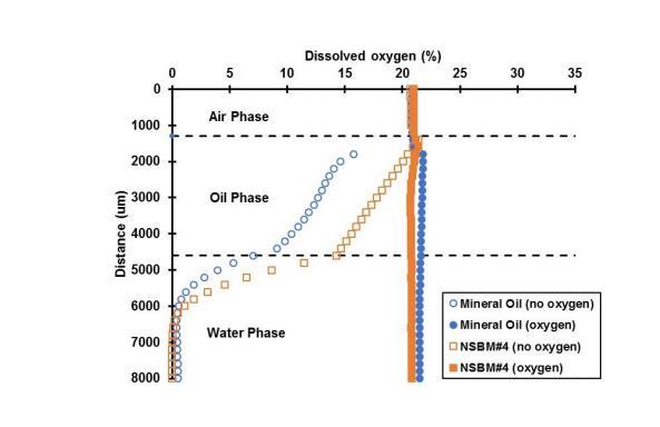 所有氧氣微剖面的測量均在100μm間隔進行,每次測量間隔30秒等待時間以穩定信號。重復剖面平均以獲得DO剖面,在每次剖面的每個距離點采集三個信號。首先,測量一個樣品的氧氣微剖面,該樣品頂部為礦物油層,底部為飽和氧氣(21%DO)的DI水層。已知氧氣在礦物油中的溶解度為3,345μL/L(1);因此,預期可以在礦物油層中測量到氧氣。在飽和條件下,所有三相中的氧氣濃度均約為21%DO(圖S9)。使用NSBM#4代替礦物油也測量了類似的氧氣微剖面,結果相似。然后,在另一個樣品中測量氧氣微剖面,該樣品頂部為礦物油層,底部為添加除氧劑(0.1 M抗壞血酸)的DI水層。很明顯,有兩個擴散過程在發生,一個在水相內,一個在油相內。使用NSBM#4和含有除氧劑的DI水也進行了類似的剖面測量,在整個油相和水相中觀察到相似的趨勢。這些剖面清晰地顯示了DO從油相(21%)到含有除氧劑的水相(0%)的擴散。該測試證明電化學傳感器技術適用于表征油到水或水到油相的乳液穩定性和化學物質傳遞。
