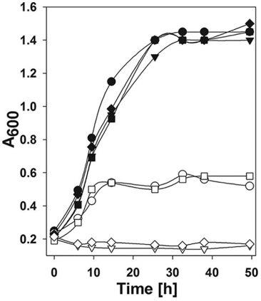 圖4、野生型和fdh突變株在H2或甲酸鹽條件下的生長(zhǎng)情況。實(shí)心符號(hào)表示H2(276 kPa;H2-CO2 80:20[體積比])條件下的生長(zhǎng);空心符號(hào)表示甲酸鹽(100 mM)條件下的生長(zhǎng)。圓形代表S2;倒三角形代表ΔfdhA1;方形代表ΔfdhA2;菱形代表ΔfdhA1-ΔfdhA2。每個(gè)數(shù)據(jù)點(diǎn)代表兩次重復(fù)實(shí)驗(yàn)的平均值。