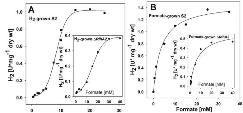 圖5、野生型菌株S2靜息細(xì)胞的甲酸鹽依賴(lài)性H2生產(chǎn)動(dòng)力學(xué),該菌株先前分別在H2(A)或甲酸鹽(B)條件下培養(yǎng)。ΔfdhA2突變體的動(dòng)力學(xué)如插圖所示。S2和ΔfdhA2突變株分別培養(yǎng)至吸光度約0.8和0.6。