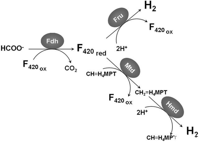 圖1、氫營(yíng)養(yǎng)型產(chǎn)甲烷菌中H2合成的潛在途徑。第一條途徑包含F(xiàn)dh和Fru。在該途徑中,F(xiàn)dh還原F420。在含硒培養(yǎng)的細(xì)胞中,F(xiàn)420H2被[Ni-Fe]氫化酶Fru氧化。第二條途徑中,F(xiàn)420H2被Mtd氧化,將亞甲基-H4MPT還原為亞甲基-H4MPT,隨后被不含鎳的氫化酶Hmd重新氧化產(chǎn)生H2。