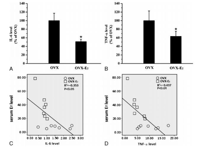 E2治療降低了心肌中IL-6和TNF-α的水平(P<0.05 vs OVX單藥;圖4A、B)。血清E2濃度與心肌中IL-6和TNF-α的濃度成反比(圖4C、D)。