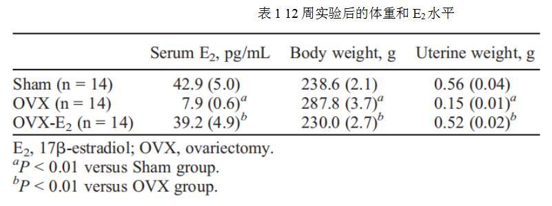經(jīng)卵巢切除術(shù)驗證,血清E2水平顯著降低,體重增加,子宮重量減少(表1)。E2治療可逆轉(zhuǎn)OVX引起的變化。