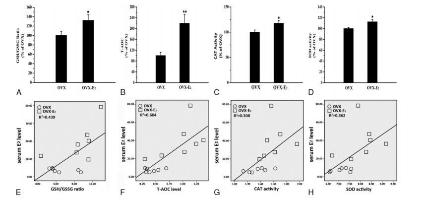 E2療法提高了GSH/GSSG比值以及T-AOC、CAT和SOD的水平(GSH/GSSG比值、CAT活性和SOD活性P<0.05;T-AOC水平與單純OVX相比P<0.01;圖3A-D)。血清E2水平與GSH/GSSG比率以及T-AOC、CAT和SOD水平呈正相關(guān)(圖3E-H)。