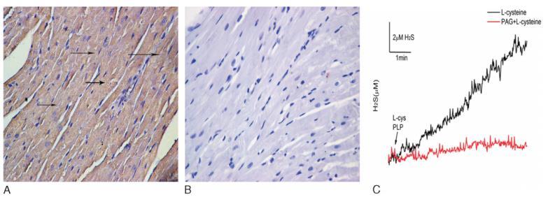 圖1心肌中γ半胱氨酸裂解酶(CSE)的表達和硫化氫(H2S)的生成。A:左心室心肌的代表性CSE免疫染色。如箭頭所示,染色主要定位于心肌細胞。B:陰性對照:CSE被過量10倍的阻斷肽預(yù)吸收。C:心肌勻漿中H2S生成的代表性痕跡。在添加或不添加CSE抑制劑D,L-丙炔基甘氨酸(PAG)的情況下,通過添加L-半胱氨酸(L-cys)和磷酸吡哆醛(PLP)啟動H2S生成。