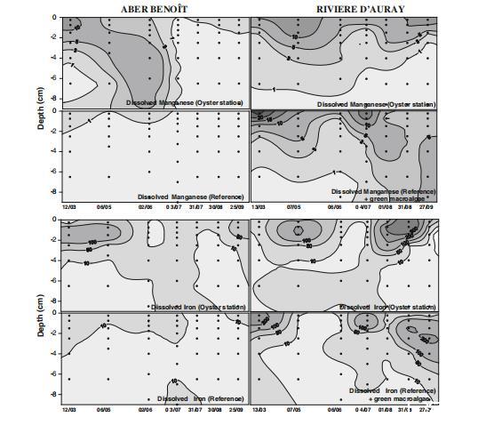 Fe2?和Mn2?剖面(圖7)顯示沉積物中Mn/Fe氧化物溶解。阿伯貝努瓦河牡蠣點下方Fe2?在3月、5月(達199 μmol l?1)和9月(達99 μmol l?1)NO?消失深度處增加。奧雷河在3月參考點(320 μmol l?1)、5月牡蠣點(221 μmol l?1)、8月牡蠣點(540 μmol l?1)和9月參考點(232 μmol l?1)有峰值。Mn2?濃度多<15 μmol l?1。