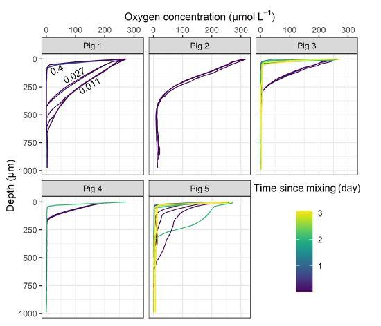 圖4、在室溫下孵育長達3天的不同豬糞中的氧含量分布。
