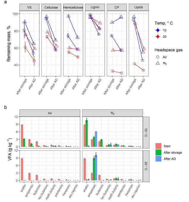 圖2、(a)有機物在儲存283天和隨后在38°C下厭氧消化(AD)172天,作為原始初始質量的分數降解。溫度和頂空交換氣體是指儲存實驗期間的條件。(b)實驗開始時和儲存283天后以及隨后在38°C下AD后豬糞漿中的揮發性脂肪酸濃度。條形和誤差線表示均值±標準差(n=4)。VS,揮發性固體;CP,粗蛋白。