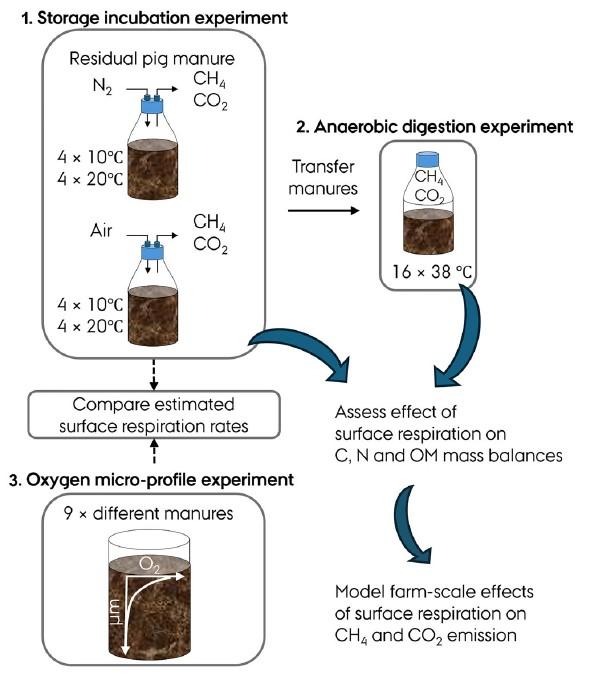 圖1、(1)用殘留的豬糞漿和不同的頂空氣體進行儲存孵化實驗,以誘導好氧或厭氧糞污表面;(2)厭氧消化實驗,實驗結束后接收貯藏孵化實驗中殘留的豬糞;(3)氧微觀剖面實驗,其中表面呼吸速率是根據糞污表面的氧氣梯度估計的,以便與儲存培養實驗估計的表面呼吸速率進行比較。估計的地表呼吸速率在農場規模的模型中實施,該模型用于評估地表呼吸對農場規模OM(有機物)水平甲烷和二氧化碳排放的影響。