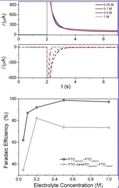對于FTO發(fā)生器-FTO集電極和FTO-納米ITO發(fā)生器-FTO集電極池,均觀察到集電極與發(fā)生器電極之間的電流鏡像效應(yīng),該效應(yīng)隨著支持電解質(zhì)的增加而減弱(圖6)。在FTO發(fā)生器-FTO集電極組件中觀察到的干擾不如在FTO-納米ITO發(fā)生器-FTO集電極池中顯著。O?產(chǎn)生的表觀法拉第效率也作為電解質(zhì)濃度的函數(shù)進(jìn)行了研究。同樣,電解質(zhì)濃度影響O?產(chǎn)生的法拉第效率,在低濃度下觀察到較低效率,而在較高濃度下效率趨于穩(wěn)定。對于任一種構(gòu)型,0.5 M的支持電解質(zhì)濃度足以在短時間內(nèi)最小化鏡像充電電流,并減少其對長時間電解期間觀察到的法拉第效率的影響。