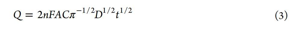 確定在施加到集電極的電位下FTO表面發(fā)生的氧還原機(jī)制對于量化集電極感應(yīng)到的O?量具有主要重要性。先前的研究表明,在FTO表面上O?的四電子還原占主導(dǎo)地位。為研究這一點,在空氣飽和溶液中進(jìn)行了計時電流測量。在pH 7溶液中恒定電位-0.85 V vs SCE下,使用Cottrell方程的積分形式(公式3)分析電荷量隨時間(Anson圖)的變化可以確定轉(zhuǎn)移的電子數(shù)?。在該方程中,n是轉(zhuǎn)移的電子數(shù),F(xiàn)是法拉第常數(shù),A是電極面積,C是O?的濃度,D是O?的擴(kuò)散系數(shù)。