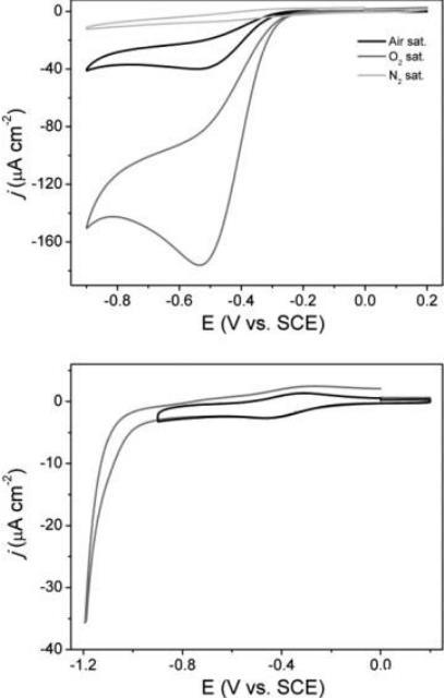 先前的研究已經(jīng)評論了FTO電極上的氧氣還原,并將其用作O?存在的診斷。圖4顯示陰極電流隨溶液中O?含量的增加而明顯增加。在-0.85 V vs SCE處的電流幅度從最低的N?飽和溶液增加到空氣飽和溶液,再到O?飽和溶液。在電解質(zhì)條件相同且僅[O?]可變的條件下,-0.85 V vs SCE處的陰極電流大小直接對應(yīng)于溶液中的氧氣濃度。在沒有O?的情況下,伏安圖顯示出先前記錄的FTO電極相同行為,在低電位(≤-1 V vs SCE)下觀察到催化電流,這是由H?的產(chǎn)生引起的。重要的是,在有和沒有O?存在下的CV比較顯示,與O?存在相關(guān)的陰極電流起始點大約在-0.2 V vs SCE。