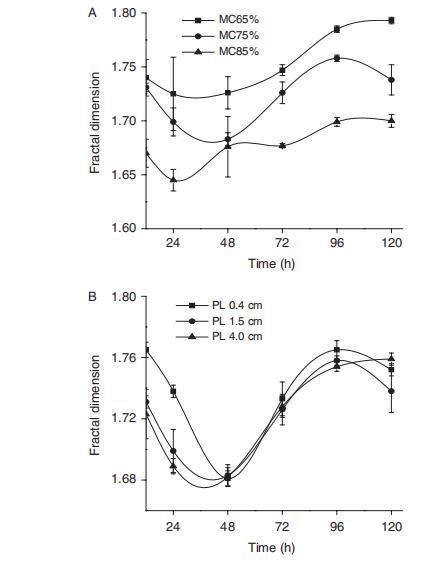 底物形態(tài)結(jié)構(gòu)因發(fā)酵過(guò)程的利用和降解作用而被真菌生長(zhǎng)明顯改變。^20,21在使用Penicillium decumbens JUA10的SSF過(guò)程中,真菌菌絲體與底物交織在一起,形成難以分離的混合物。在先前的研究中,分形維數(shù)已被有效地用于評(píng)估真菌-底物復(fù)合物。圖2顯示,SSF中的分形維數(shù)在水含量實(shí)驗(yàn)中遵循65%>75%>85%的順序,在顆粒長(zhǎng)度實(shí)驗(yàn)中遵循0.4 cm>1.5 cm>4.0 cm的順序。結(jié)果表明,高水分含量和大顆粒長(zhǎng)度提供了最低的分形維數(shù)。同時(shí),有趣的是,分形維數(shù)在發(fā)酵時(shí)間從12小時(shí)到48小時(shí)期間下降,然后在發(fā)酵時(shí)間從48小時(shí)到120小時(shí)期間增加。造成這種情況的可能原因是,在真菌生長(zhǎng)的早期階段,由于真菌占據(jù)底物內(nèi)部空間,分形維數(shù)降低。然而,隨著發(fā)酵時(shí)間的增加,真菌利用導(dǎo)致固態(tài)底物分解成小塊,這導(dǎo)致底物的分形維數(shù)逐漸增加。同樣有趣的是,發(fā)酵48小時(shí)后不同顆粒長(zhǎng)度的分形維數(shù)差異小于發(fā)酵48小時(shí)前的差異(圖2(B))。造成這種情況的可能原因是,大顆粒長(zhǎng)度生物質(zhì)在48小時(shí)后被降解成小塊。同時(shí),小顆粒長(zhǎng)度生物質(zhì)在發(fā)酵過(guò)程中容易團(tuán)聚,然后在固態(tài)發(fā)酵后期顆粒長(zhǎng)度生物質(zhì)的差異減小,這導(dǎo)致相應(yīng)的分形維數(shù)差異也減小。因此,結(jié)果表明,分形維數(shù)可以有效地表達(dá)底物形態(tài)結(jié)構(gòu)的變化,并且也可以在固態(tài)發(fā)酵中不同水分含量和顆粒長(zhǎng)度下表征真菌生物量的相應(yīng)增長(zhǎng)。