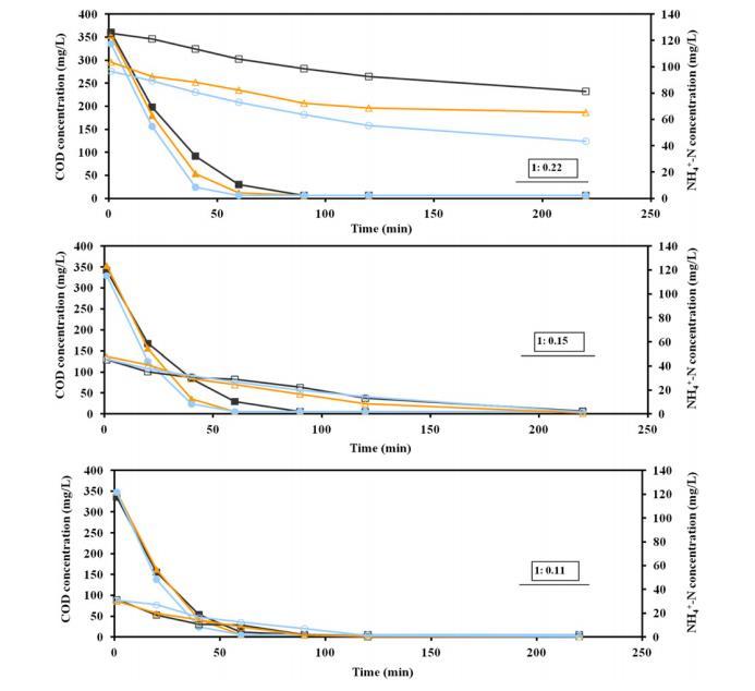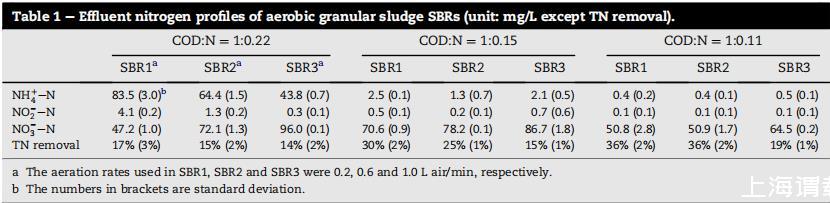在三個SBRs(分別以0.2、0.6和1.0 L空氣/分鐘的曝氣速率運行)在三個COD:N比值(1:0.22,1:0.15和1:0.11)下,平均COD去除效率均超過99%。三個SBRs在三個COD:N比值下運行的出水NH 4+?N,NO 2??N和NO 3??N濃度如表1所示。