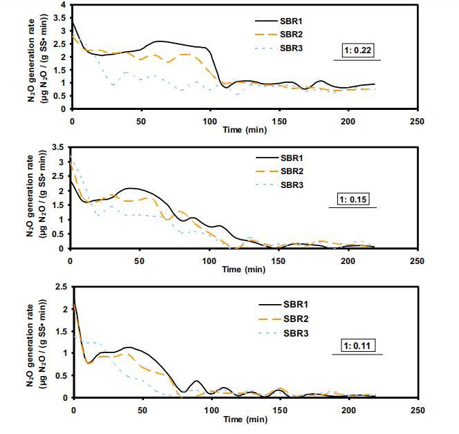 然而,在曝氣速率為1.0 L空氣/分鐘的SBR3中,DO濃度在曝氣開始后急劇上升,并在10-20分鐘后在液相中達到飽和(圖2)。N2O濃度在曝氣開始后下降。平均比N2O產生速率下降并在COD:N比為1:0.22和1:0.15時穩定在約1.1μg N?O/(g SS·分鐘)。當COD:N比為1:0.11時,由于進水氮濃度較低,平均比N?O產生速率持續下降至0.2μg N?O/(g SS·分鐘)(圖3)。高曝氣速率導致體相流體中DO水平較高,這可能誘導氧氣更深地擴散到顆粒中并抑制反硝化作用。SBR3中比SBR1和SBR2更低的TN去除率表明了這種抑制。因此,SBR3中的N?O產生量低于SBR1和SBR2。