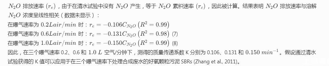 N2O排放速率left(r e),由于在清水試驗中沒有N2O產生,等于N2O累積速率left(r c),因此被計算。結果表明N2O排放速率與溶解N2O濃度呈線性相關。