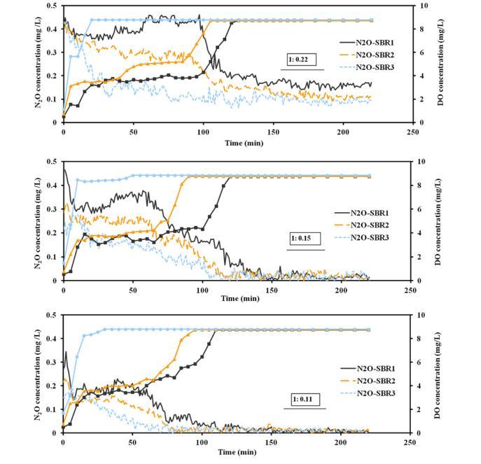 在SBR1、SBR2和SBR3中,當處理COD:N比為1:0.22的廢水時,出水溶解N?O濃度分別為0.17 mg/L、0.11 mg/L和0.09 mg/L,分別相當于出水中總氮的0.13%、0.08%和0.06%。當處理其他兩種COD:N比值的合成廢水時,出水N?O濃度均低于0.01 mg/L。