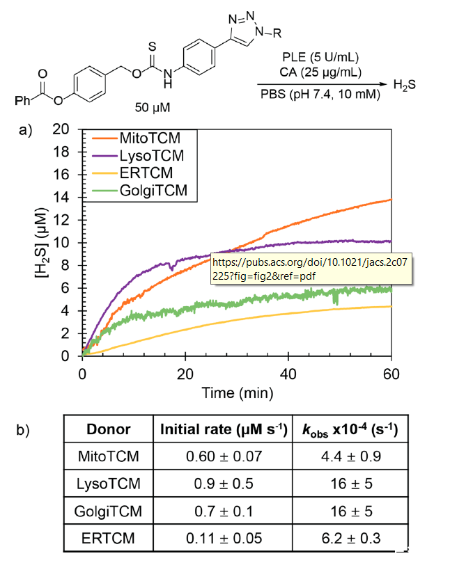 圖2、(a)在PBS(10 mM,pH 7.4)中的PLE(5 U mL)和CA(25μg mL)存在下,細胞器靶向中藥(50μM)的HS釋放。實驗一式三份進行,顯示的釋放曲線是平均值(n=3)。(b)硫化氫釋放速率以初始速率(μM s)和偽1階速率常數(k)報告,結果表示為平均值±SE(n=3)。