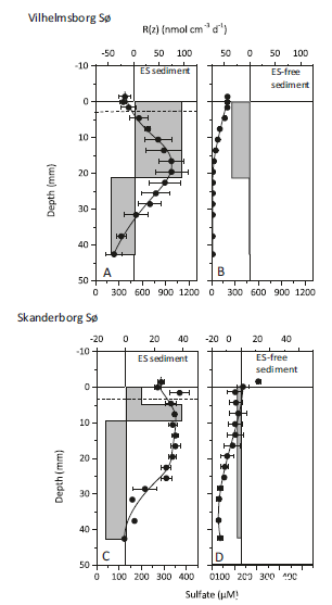 圖2、Vilhelmsborg S?(a,b)和Skanderborg S?(c,d)的ES沉積物中ES沉積物中的硫酸鹽濃度(黑點)、R(z)(灰色條)和無ES沉積物。誤差線表示平均值的標準誤差(n=3)。R(z)的正值表示硫酸鹽的凈產量,負值表示硫酸鹽的凈消耗量。黑線表示建模的硫酸鹽濃度。a和c中的虛線表示含氧區的下邊界。