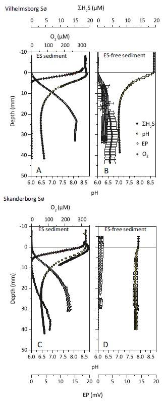 圖1、Vilhelmsborg S?(a,b)和Skanderborg S?(c,d)的ES沉積物和無ES沉積物中∑HS濃度(黑點)、pH(黃點)、電位(EP)分布(白點)和氧濃度(紅點)的深度剖面。誤差線表示平均值的標準誤差(n=36)。僅繪制每個數據系列的每兩個點。在ES沉積物中測量了兩個系列的pH值曲線:一個系列在沉積物的上部6 mm中以100μm的深度分辨率測量,另一個系列在整個域中以400μm的深度分辨率測量。