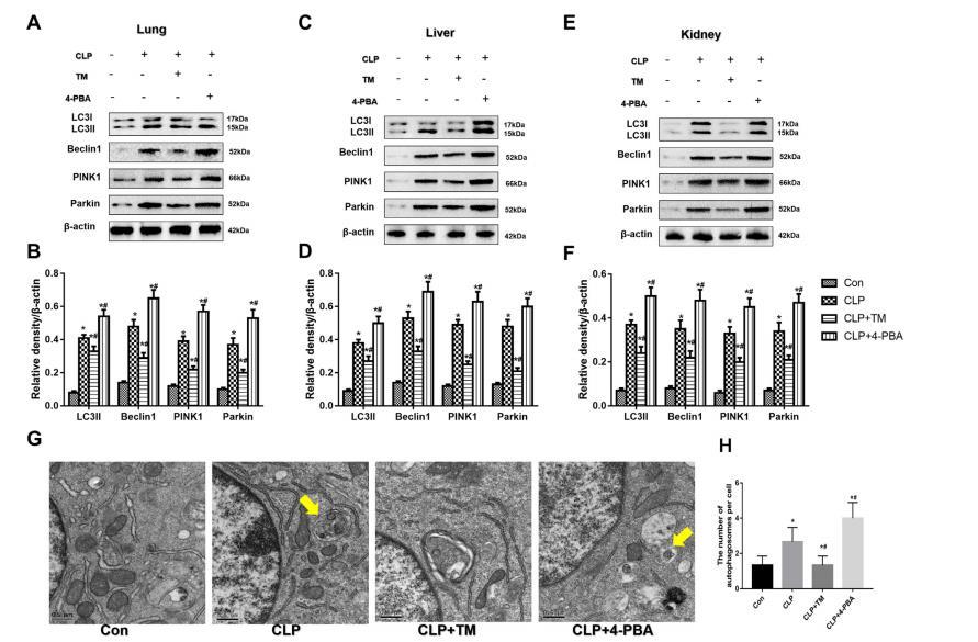 圖4:4-PBA和TM對膿毒癥小鼠自噬相關蛋白和重要器官的影響。CLP前腹腔注射4-PBA和TM,CLP12小時后收集肺、肝和腎樣本。通過Western印跡檢測敗血癥小鼠肺(A和D)、肝(B和E)和腎(C和F)組織中LC3、Beclin1、PINK1和Parkin的表達。給小鼠實施中電手術和注射4-PBA和TM后,用透射電子顯微鏡觀察自噬體(G)。黃色箭頭表示雙膜自噬體或自溶體。