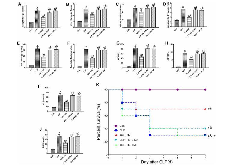 氫氣可防止敗血癥中的器官功能障礙和損傷。與CLP組相比,氫氣顯著改善了敗血癥的肺、肝和腎組織損傷、BLA總蛋白、MPO活性、肺W/D重量、血清AST、ALT、Cr和BUN以及存活率(圖10)。與CLP+H2組相比,3-MA或ERS誘導劑TM對自噬的抑制部分逆轉了氫氣對CLP+H2+3-MA組和CLP+H2+TM組上述指標的保護作用(圖10)。這些結果表明,在膿毒癥中,氫氣通過激活自噬和ERS途徑失活,促進對器官損傷和器官功能障礙的保護,并提高存活率。