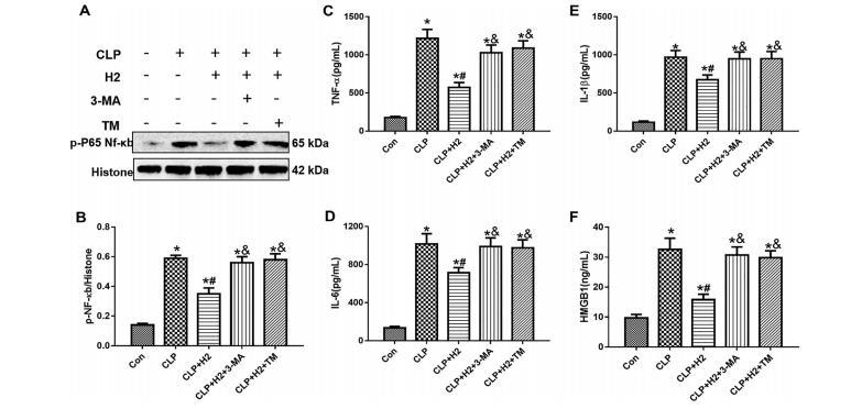 為了驗證自噬和ERS對敗血癥小鼠服用氫氣后炎癥的影響,我們檢測了NF-κb和細胞因子。NF-κb是各種炎癥條件下促炎信號的典型標志物。值得注意的是,CLP手術后氫處理可減輕NF-κb的p65亞基和細胞因子TNF-α、IL-1β、IL-6和HMGB1(圖9)。服用3-MA或TM會降低氫氣對CLP小鼠NF-κb和細胞因子的抑制作用。這些結果表明,氫氣可通過自噬激活和ERS通路失活減輕敗血癥的炎癥反應。