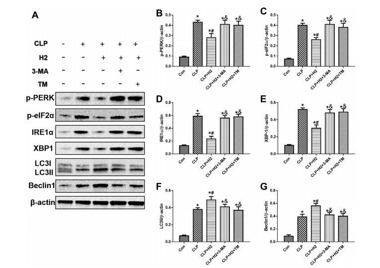 為了進一步研究氫氣、3-MA和TM對敗血癥小鼠ER應激和自噬的影響,研究人員給小鼠注射了氫氣。與CLP組相比,氫氣顯著降低了CLP小鼠p-PERK、p-eIF2α、IRE1α和XBP1的表達,并增強了LC3II和Beclin1的表達(圖8)。然而,用ERS誘導劑(TM)或自噬抑制劑(3-MA)處理可減弱氫氣對CLP操作后p-PERK、p-eIF2α、IRE1α、XBP1、LC3II和Beclin1的影響(圖8)。總之,這些結果證實了氫氣可通過自噬途徑緩解膿毒癥中的ER應激。