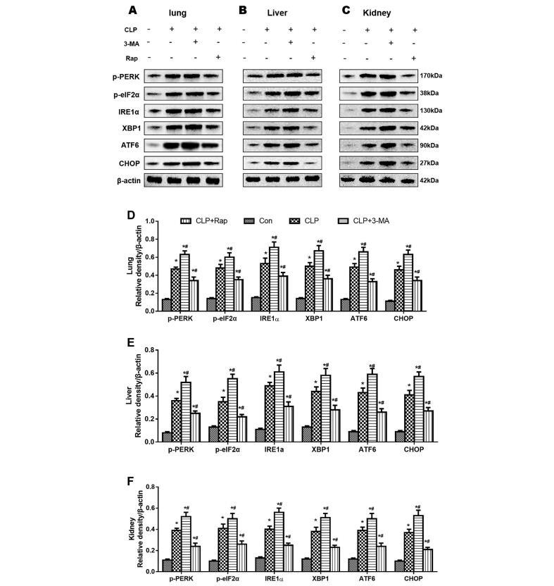 以前的文獻表明,ERS調節自噬途徑的激活。但自噬是否能調節膿毒癥中ERS的活性呢?為了回答這個問題,我們分別給予Rap和3-MA(一種誘導劑和抑制劑),并測量了CLP小鼠肺、肝和腎組織中的ERS蛋白水平。結果表明,與CLP組相比,3-MA加劇了CLP+3-MA組小鼠肺(圖7A和D)、肝(圖7B和E)和腎組織(圖7C和F)中p-PERK和peIF2α、CHOP、ATF4、IRE1α和XBP1表達的增加(圖7)。然而,與CLP組相比,自噬誘導劑Rap可抑制CLP操作誘導的這些指標的增加(圖7)??傊?,這些結果表明,自噬活性的增加可減輕敗血癥的ERS。