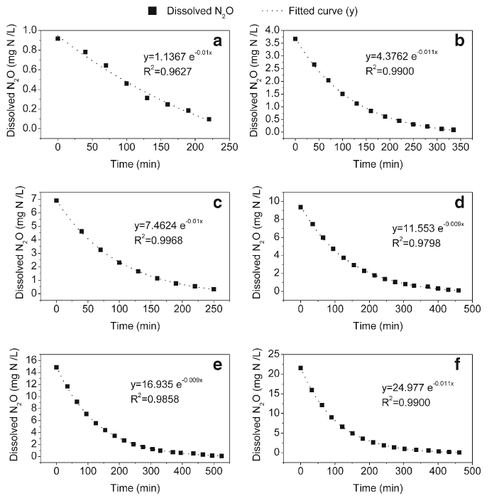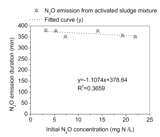 圖5、不同初始N?O濃度下活性污泥混合物中的N2O排放持續時間。圖中顯示了不同初始N?O濃度下,活性污泥混合物中N2O排放至濃度降至0.1 mg N/L所需的時間。結果顯示,隨著初始N?O濃度的增加,排放持續時間呈線性減少。