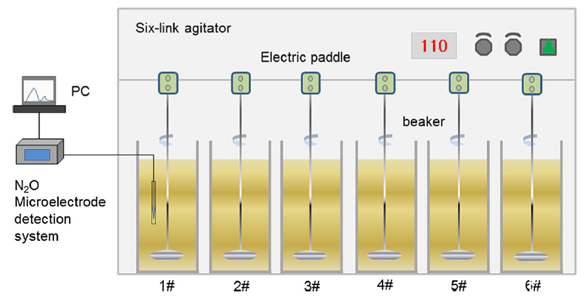 圖1、反應裝置示意圖。圖中展示了實驗所用的六聯攪拌器(JJ-4A)和六個相同的敞口燒杯(500 mL),用于進行N2O排放實驗。燒杯中分別加入蒸餾水或活性污泥混合物,并注入不同體積的壓縮N2O氣體,通過攪拌使N2O充分溶解并持續逸出。