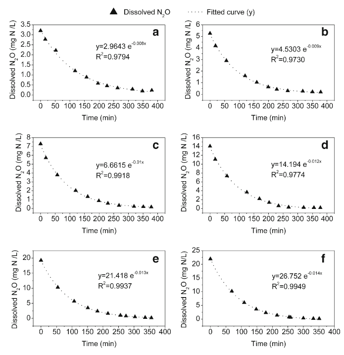 結果表明,蒸餾水中N?O的總容積傳質系數相對穩定,約為0.01/min,不受初始N?O濃度的影響。這表明在蒸餾水中,N2O的排放速率僅與實時溶解態N?O濃度相關。相比之下,活性污泥混合物中N?O的總容積傳質系數隨初始N2O濃度的增加而增大,范圍為0.008–0.014/min。這一現象歸因于活性污泥中微生物的內源反硝化作用,即微生物利用胞內儲存的聚合物作為電子供體,將N2O還原為N2,從而加速了N?O的消耗。當初始N?O濃度高于15 mg N/L時,活性污泥混合物與蒸餾水之間的N?O排放速率差異趨于穩定,約為0.53 mg N/L·min,這可視為微生物內源反硝化的反應速率。由于活性污泥混合物中的N?O排放過程受到微生物生化反應的顯著影響,其總容積傳質系數不能真實反映N2O的傳質過程,因此不適用于計算N?O的排放速率和總量。相反,蒸餾水體系中的N?O排放特性更為穩定,建議在開放系統中使用蒸餾水來測定N?O的總容積傳質系數,以提高對污水處理過程中N2O排放機制的理解和估算精度。