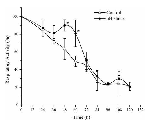 陽離子轉運ATP酶在DNA微陣列中高表達,表明陽離子轉運加速以中和pH的變化。此外,將氫離子轉運進出細胞膜會消耗大量ATP,這也解釋了下面關于菌絲體呼吸活性的現象。另外,應該注意的是,三羧酸循環(huán)導致胞外pH上升,而糖酵解和谷氨酸的合成通常導致酸化。因此,pH沖擊組中的pH波動可能是碳水化合物和氨基酸代謝快速消耗的綜合結果。