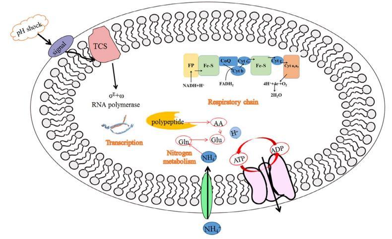 簡而言之,這些DEGs主要與氨基酸代謝、細胞過程和信號轉導以及信息儲存和處理相關。此外,通過qRT-PCR分析驗證了關鍵基因的動態(tài)變化。在轉錄變化方面,DNA微陣列和qRT-PCR分析之間顯示出良好的一致性,表明了微陣列數據的可靠性。可以推測,在胞外pH沖擊下,細胞壁接收到的脅迫信號通過雙組分系統(tǒng)進行轉導。然后由雙組分系統(tǒng)調控的ECFσ因子將與核心酶一起作用于下游基因并激活細胞防御系統(tǒng)。最終,營養(yǎng)物質和離子轉運加速,導致葡萄糖代謝、氨基酸代謝、呼吸鏈和其他生理活動的變化,同時也緩解了堿刺激并促進了Val-A的生物合成。