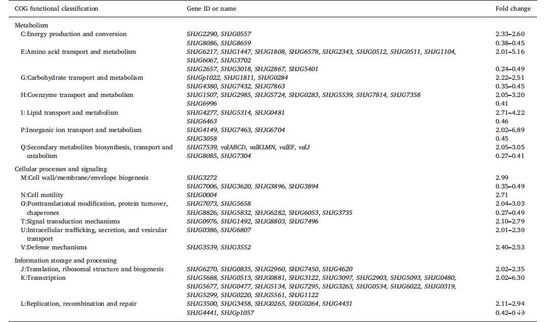 使用倍數變化2且p<0.5的統(tǒng)計標準,在菌株5008中共鑒定出146個pH沖擊下的差異表達基因(DEGs)(表1)。pH沖擊下顯著差異表達的基因主要分配于代謝、細胞過程和信號傳導以及信息儲存和處理相關的功能。正如預期的那樣,除糖基轉移酶基因valG外,大多數Val-A生物合成基因的轉錄水平在pH沖擊下均增強。